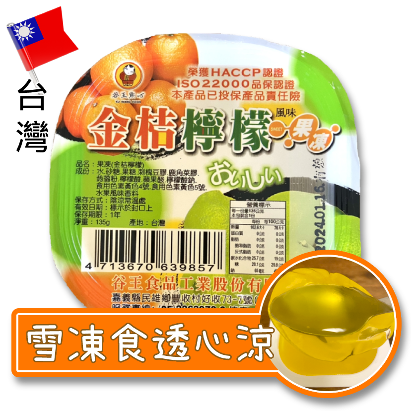 💁♂️現批次有效日期:2026年5月9日 🔸金桔檸檬風味 🔹微酸香甜,生津解喝 🔸雪凍後食風味更佳 📣兒童及老人食用時,請咀嚼或切小塊後進食,切勿整粒吞食 💁🏻♀️Facebook介紹重溫👇🏻 https://www.facebook.com/ganionveggie/posts/pfbid0299mRMBBKYLe73kLChLn9jTRqQHeiDtA5j64F3c1rJpAPNign1utgywDd1npShKqbl 成份:水、砂糖、果糖、鹿角菜膠、蒟蒻粉、檸檬酸、蘋果酸、檸檬酸鈉、食用色素(黃色四號、黃色五號)、水果風味香料。 淨重:135克 產地:台灣