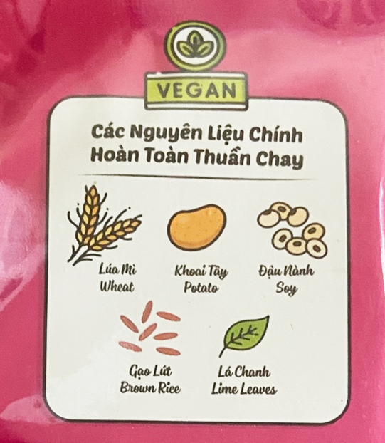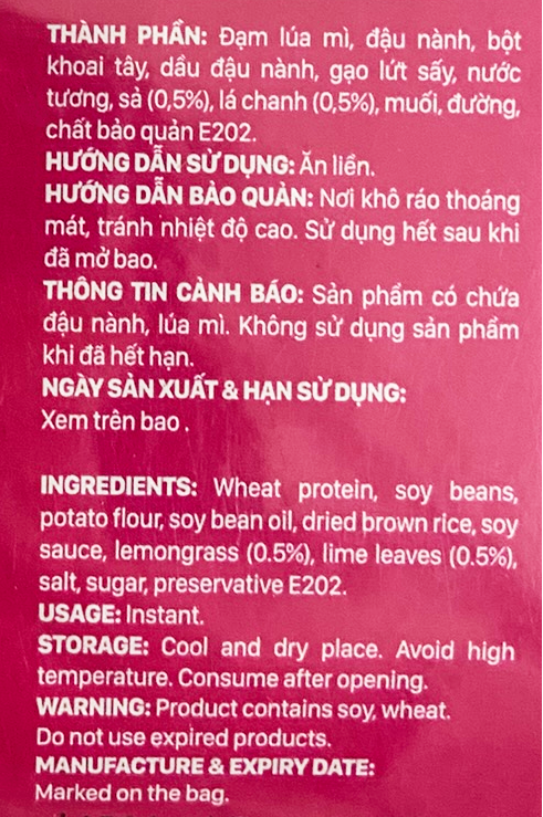 成份:小麥蛋白、大豆、馬鈴薯粉、大豆油、乾燥糙米、醬油、檸檬草、青檸葉、鹽、糖、山梨酸鉀(E202)。