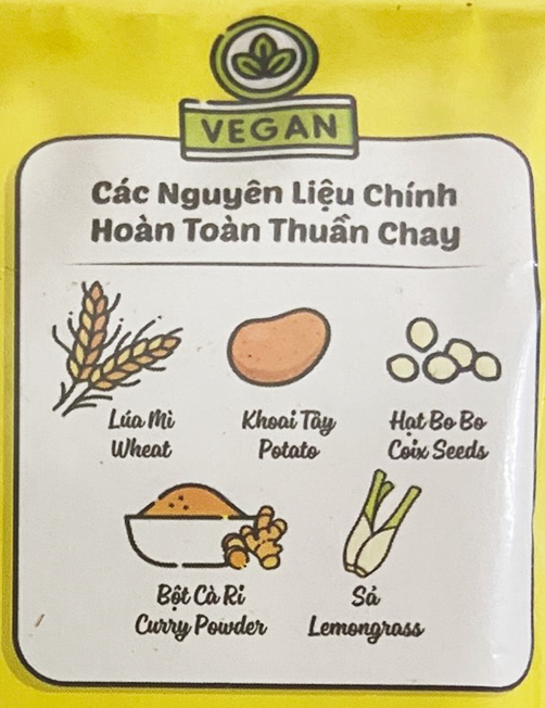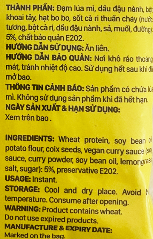 成份:小麥蛋白、大豆油、馬鈴薯粉、薏米、純素咖哩醬(醬油、咖哩粉、大豆油、檸檬草、鹽、糖)、山梨酸鉀(E202)。