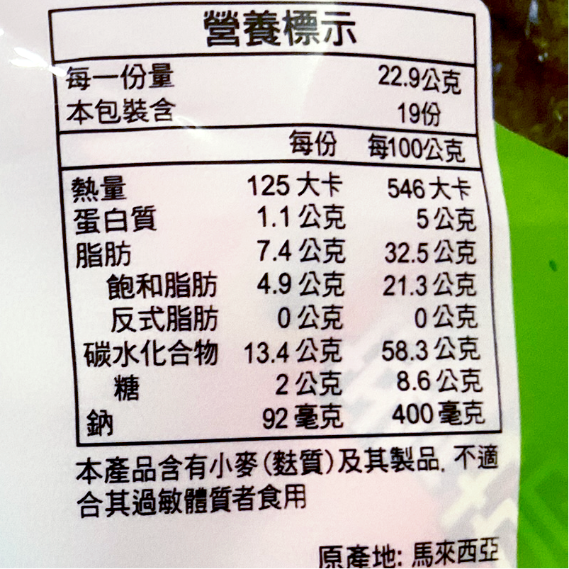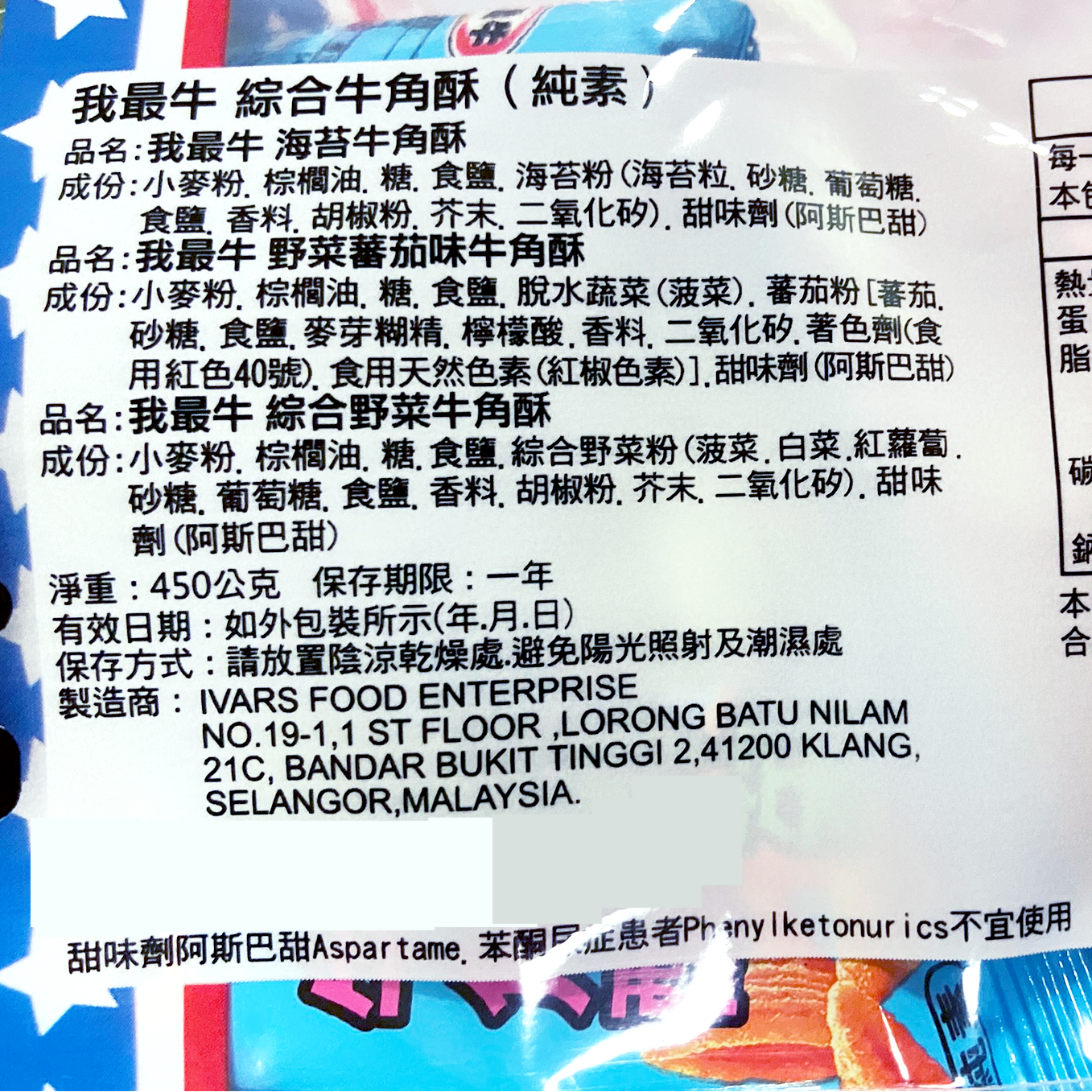***每袋所含不同口味之牛角酥數量或有不同,敬請留意*** 💁♂️現批次有效日期:2026年5月11日 🔸經典口味零食 🔹每袋含3款口味 🔸粒粒香脆,好吃不膩 🔹小包裝方便攜帶,乾淨衛生 📣產品容易受潮,開封後請盡快享用喔! 海苔味 成份:小麥粉、棕櫚油、糖、食鹽、海苔粉、(海苔粒、砂糖、葡萄糖、食鹽、香料、胡椒粉、芥末、二氧化矽)、甜味劑(阿斯巴甜)。 野菜番茄味 成份:小麥粉、棕櫚油、糖、食鹽、脫水蔬菜(菠菜)、蕃茄粉[(蕃茄、砂糖、食鹽、麥芽糊精、檸檬酸、香料、二氧化矽、著色劑(食用紅色40號)、食用天然色素(紅椒色素)]、甜味劑(阿斯巴甜)。 綜合野菜味 成份:小麥粉、棕櫚油、糖、食鹽、綜合野菜粉(菠菜、白菜、紅蘿蔔、砂糖、葡萄糖、食鹽、香料、胡椒粉、芥末、二氧化矽)、甜味劑(阿斯巴甜)。 內含致敏物:小麥及其製品 本產品使用甜味劑阿斯巴甜,苯酮尿症患者(Pheny lketonur-ics)不宜使用。 淨重:450克 產地:馬來西亞