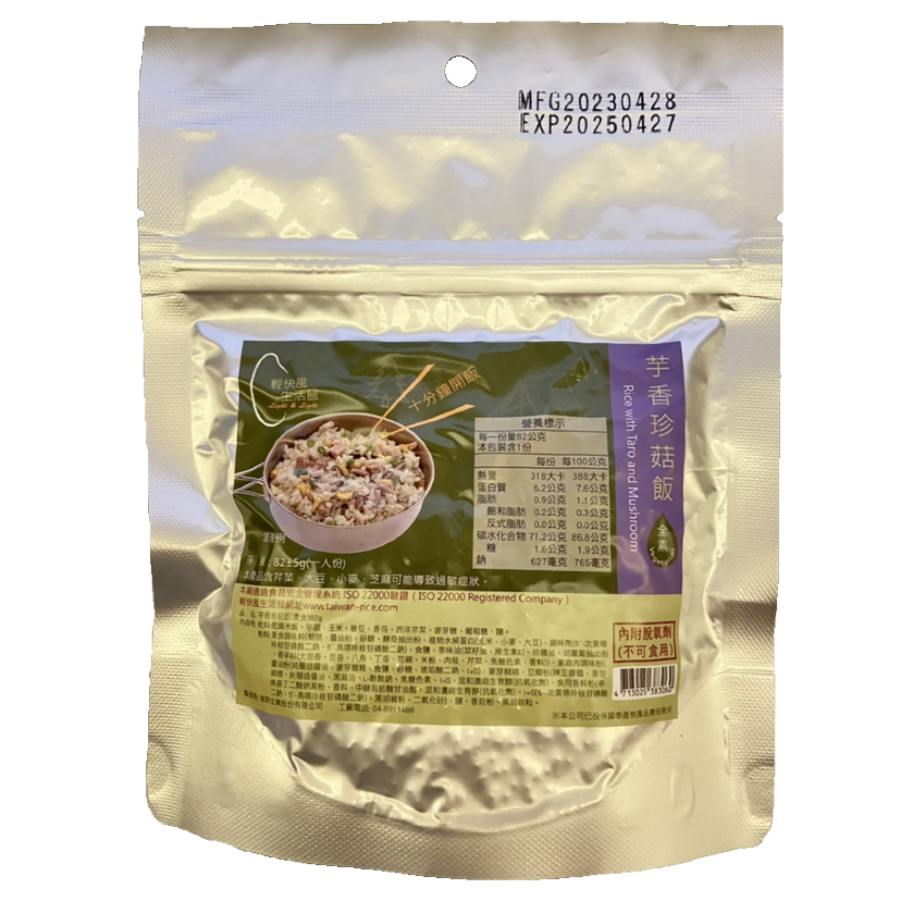 📣敬請取出防潮劑! 📣強烈建議加水之前充分搖勻內容物,否則或會令調味不平均! 芋香珍菇(全素) 💁♂️現批次有效日期:2027年7月20日 甜椒素雞(全素) 💁♂️現批次有效日期:2027年7月13日 味噌海帶芽(全素) 💁♂️現批次有效日期: 茄牛素菜(全素) 💁♂️現批次有效日期: 筍香(蛋奶素) 💁♂️現批次有效日期: 🔸採用台灣產蓬萊米 🔹採站立夾鍊袋式包裝,內附控制水位之注水線標示 🔸可直接將滾水注入袋內,沖泡十分鐘即可食用 🔹亦可凍水沖泡或微波加熱 🔸方便於旅行或露營時等食用 💁🏻♀️Facebook介紹重溫👇🏻 https://www.facebook.com/ganionveggie/posts/pfbid02AAxVxYxy327chwWWAyDt7aubxayKSo6Fm3LSP1QAeMgSANoyhD6K6E3atAjYki1Vl 芋香珍菇 成分: 乾料:乾燥米飯、芋頭、玉米、敏豆、香菇、西洋芹菜、麥芽糖、葡萄糖、鹽。 粉料:素食調味粉(糊精、醬油粉、砂糖、酵母抽出物、植物蛋白分解物(玉米、小麥、大豆)、調味劑(5'-次黃嘌呤核苷磷酸二納、5'-鳥嘌呤核苷磷酸二納)、食鹽、香味油(菜籽油、維生素E)、棕櫚油、胡蘿蔔抽出物、香辛料(大茴香、茴香、八角、丁香、花椒、米粉、肉桂、芹菜、焦糖色素、香料)、素雞肉調味粉(醬油粉(純釀造醬油、麥芽糊精、食鹽、砂糖、琥珀酸二鈉、I+G)、麥芽糊精、豆瓣粉(辣豆瓣醬、麥芽糊精、純釀造醬油、黑麻油、L-麩酸鈉、焦糖色素、I+G、 混和濃縮生育醇(抗氧化劑)、食用香料粉(辛烯基丁二酸鈉澱粉、香料、中鏈脂肪酸甘油脂、 混和濃縮生育醇(抗氧化劑)、I+G(5'-次黃嘌呤核苷磷酸二納、5'-鳥嘌呤核苷磷酸二納)、黑胡椒粉、二氧化矽)、鹽、香菇粉、黑胡椒粒。 內含致敏物:芹菜、大豆、小麥、芝麻。 淨重:82克 ± 5克 甜椒素雞 成分: 乾料:乾燥米飯、胡蘿蔔、高麗菜、青甜椒、香菇、黑木耳、D-山梨醇液(甜味劑)、葡萄糖、麥芽糖、鹽。 粉料:素雞肉調味粉(醬油粉(純釀造醬油、麥芽糊精、食鹽、砂糖、琥珀酸二鈉、I+G)、麥芽糊精、豆瓣粉(辣豆瓣醬、麥芽糊精、純釀造醬油、黑麻油、L-麩酸鈉、焦糖色素、I+G、 混和濃縮生育醇(抗氧化劑)、食用香料粉(辛烯基丁二酸鈉澱粉、香料、中鏈脂肪酸甘油脂、 混和濃縮生育醇(抗氧化劑)、I+G(5'-次黃嘌呤核苷磷酸二納、5'-鳥嘌呤核苷磷酸二納)、黑胡椒粉、二氧化矽)、大豆油粉(大豆油、麥芽糊精、辛烯基丁二酸鈉澱粉、脂肪酸甘油脂(植物性)、香料、二氧化矽、磷酸鈣、混和濃縮生育醇(抗氧化劑 ))、鹽、素食調味粉(糊精、醬油粉、砂糖、酵母抽出物、植物蛋白分解物(玉米、小麥、大豆)、調味劑(5'-次黃嘌呤核苷磷酸二納、5'-鳥嘌呤核苷磷酸二納)、食鹽、香味油(菜籽油、維生素E)、棕櫚油、胡蘿蔔抽出物、香辛料(大茴香、茴香、八角、丁香、花椒、米粉、肉桂、芹菜、焦糖色素、香料))、辣椒粉。 內含致敏物:芹菜、大豆、小麥、芝麻。 淨重:84克 ± 5克 味噌海帶芽 成分: 乾料:乾燥米飯、胡蘿蔔、海帶芽、大白菜、香菇、薑、麥芽糖、葡萄糖、鹽。 粉料:味噌粉(蓬萊米、黃豆(非基因改造)、精鹽、酒精)、素雞肉調味粉(醬油粉(純釀造醬油、麥芽糊精、食鹽、砂糖、琥珀酸二鈉、I+G)、麥芽糊精、豆瓣粉(辣豆瓣醬、麥芽糊精、純釀造醬油、黑麻油、L-麩酸鈉、焦糖色素、I+G、 混和濃縮生育醇(抗氧化劑)、食用香料粉(辛烯基丁二酸鈉澱粉、香料、中鏈脂肪酸甘油脂、 混和濃縮生育醇(抗氧化劑)、I+G(5'-次黃嘌呤核苷磷酸二納、5'-鳥嘌呤核苷磷酸二納)、黑胡椒粉、二氧化矽)、香菇粉、鹽。 內含致敏物:大豆、小麥、芝麻。 淨重:85克 ± 5克 產地:台灣 茄牛素菜 成分: 乾料:乾燥米飯、地瓜、番茄、豌豆仁、西洋芹菜、葡萄糖、鹽。 粉料:素牛肉調味粉( 純釀造醬油、麥芽糊精、食鹽、砂糖、琥珀酸二鈉、辣豆瓣醬、黑麻油、L-麩酸鈉、焦糖色素、混合濃縮生育醇( 抗氧化劑 )、辛烯基丁二酸鈉澱粉、香料、中鏈脂肪酸甘油脂、 5'-次黃嘌呤核苷酸二納、5'鳥嘌呤核苷酸二納、黑胡椒粉、二氧化矽 )、大豆油粉( 大豆油、麥芽糊精、辛烯基丁二酸鈉澱粉、脂肪酸甘油脂( 植物性 )、香料、二氧化矽、磷酸鈣、混合濃縮生育醇( 抗氧化劑 ) )、素食調味粉( 糊精、醬油粉、酵母精粉、砂糖、植物蛋白分解物( 玉米、小麥、大豆 )、調味劑( 5'-次黃嘌呤核苷酸二納、5'鳥嘌呤核苷酸二納 )、香味油( 菜籽油、維生素E )、氫化棕櫚油、胡蘿蔔精粉、香辛料( 大茴香、茴香、八角、丁香、花椒、米粉、肉桂、芹菜 )、鹽、焦糖色素、香料 ) 、鹽。 內含致敏物:芹菜、大豆、小麥、芝麻。 淨重:85克 ± 5克 筍香 成分: 乾料 : 乾燥米飯、竹筍、高麗菜、香菇、木耳、胡蘿蔔、葡萄糖、鹽、烏醋、醬油、D-山梨醇液(甜味劑)、I+G(5'-次黃嘌呤核苷磷酸二納、5'-鳥嘌呤核苷磷酸二納)。 粉料 : 素食調味粉(酵母精粉、砂糖、菜籽油、胡蘿蔔精粉、肉桂、芹菜、棕櫚油、大茴香、茴香、八角、丁香、花椒、5'-次黃嘌呤核苷酸二納、5'鳥嘌呤核苷酸二納、維生素E (抗氧化劑)、鹽、醬油粉(醬油液、麥芽湖精、5'-次黃嘌呤核苷酸二納、5'鳥嘌呤核苷酸二納、L-丙胺酸、琥珀酸二納、焦糖 ))。 內含致敏物:芹菜、大豆、小麥。 淨重:85克 ± 5克 產地:台灣