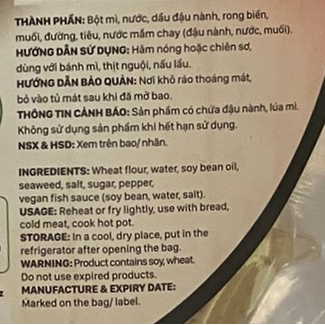💁♂️現批次最佳食用日期:2026年10月3日 🔸地道越南風味 🔹常溫儲存 🔸即開即食,可搭配麵包、用作冷盤、火鍋 🔹亦可煎香、煮、炒加熱食用 成份: 小麥粉、水、大豆油、海藻、鹽、糖、胡椒粉、素魚露(大豆、水、鹽)。 內含致敏物:小麥、大豆及其製品。 淨重:250 克 產地:越南
