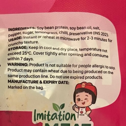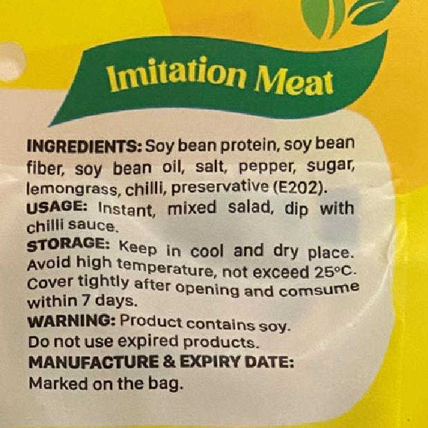魷魚絲( 黃色包裝袋) 💁♂️現批次有效日期:2026年10月15日 魚肉乾( 紅色包裝袋) 💁♂️現批次有效日期:2026年11月4日 🔸有得咬既零食 🔹微微辣口味 🔸愈嚼愈過癮,愈嚼愈想食 🔹**魚肉乾**可立即食用或以微波爐加熱約2-3分鐘,直至酥脆滾燙。 魷魚絲 成份:大豆蛋白、大豆纖維、大豆油、鹽、胡椒、糖、香茅、辣椒、防腐劑(E202)。 內含致敏物:大豆及其製品。 淨重:50克 產地:越南 魚肉乾 成份:大豆蛋白、大豆油、鹽、胡椒、糖、香茅、辣椒、防腐劑(INS 202)。 內含致敏物:大豆及其製品。 淨重:50克 產地:越南