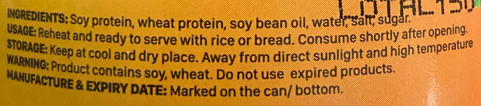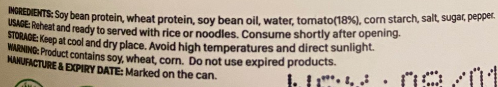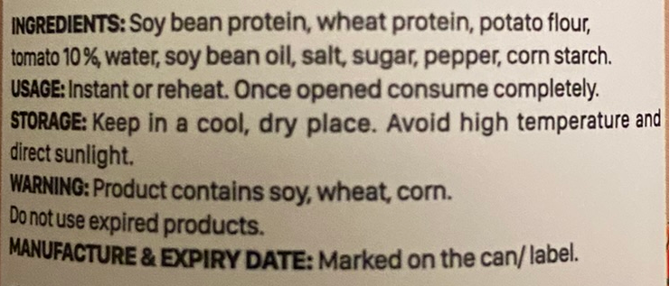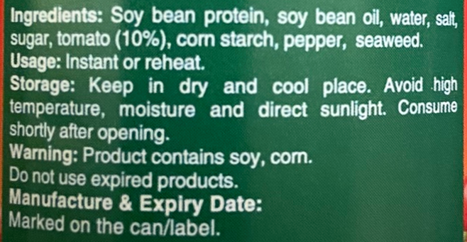 越南法包豬肝醬 💁♂️現批次有效日期:2027年8月19日 豆醬魚塊 💁♂️現批次有效日期:2026年9月25日 五花腩肉 💁♂️現批次有效日期:2027年8月22日 厚切肉排( 𝟮片入) 💁♂️現批次有效日期: 茄汁肉丸 💁♂️現批次有效日期:2027年3月28日 茄汁香腸 💁♂️現批次有效日期: 茄汁沙甸魚 💁♂️現批次有效日期:2027年7月3日 🔸即開即食 🔹越南法包豬肝醬適用於配合麵包食用 🔸豆醬魚塊、五花腩肉開飯加餸超方便 🔹厚切肉排適用於炒飯、麵、湯、火鍋、漢堡、越南河粉 🔸茄汁肉丸配飯、麵、意粉皆宜 🔹茄汁香腸、茄汁沙甸魚香濃惹味,配麵包、飯麵皆宜 📣部份貨品運抵本港時有不同程度凹罐情況,我們將隨機發貨。而出貨運送過程中亦可能會產生凹罐情況,但不影響產品質量及味道,購買前敬請考慮清楚! 越南法包豬肝醬 成份:大豆蛋白、小麥蛋白、大豆油、水、胡椒、糖、鹽。 內含致敏物:大豆、小麥及其製品。 淨重:120克 產地:越南 豆醬魚塊 成份:大豆蛋白、小麥蛋白、大豆油、水、醬油4%、玉米澱粉、海藻、胡蘿蔔、胡椒、糖、鹽。 內含致敏物:大豆、小麥及其製品。 淨重:140克 產地:越南 五花腩肉 成份:大豆蛋白、小麥蛋白、大豆油、水、胡椒、糖、鹽。 內含致敏物:大豆、小麥及其製品。 淨重:140克 產地:越南 厚切肉排( 𝟮片入) 成份:大豆蛋白、小麥蛋白、大豆油、水、鹽、糖。 內含致敏物:大豆、小麥 淨重:140克 產地:越南 茄汁肉丸 成份:大豆蛋白、小麥蛋白、大豆油、水、蕃茄18%、玉米澱粉、鹽、糖、胡椒。 內含致敏物:大豆、小麥 淨重:160克 產地:越南 茄汁香腸 成份:大豆蛋白、小麥蛋白、馬鈴薯粉、蕃茄10%、水、大豆油、鹽、糖、胡椒、玉米澱粉。 內含致敏物:大豆、小麥 淨重:165克 產地:越南 茄汁沙甸魚 成份:大豆蛋白、大豆油、水、鹽、糖、蕃茄10%、玉米澱粉、胡椒、海藻。 內含致敏物:大豆 淨重:150克 產地:越南